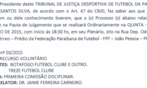 O Pleno do Tribunal de Justiça Desportiva de Futebol da Paríba julga Recurso do Botafogo Futebol Clube, Treze Futebol Clube e Campinense...