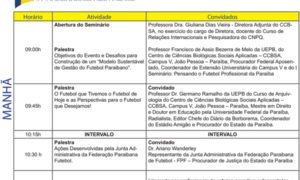 A programação do I SEMINÁRIO: PENSANDO O FUTEBOL PROFISSIONAL DA PARAÍBA indica o início do evento para terça-feira, dia 14, de acordo...
