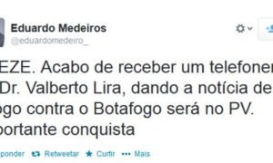 O presidente do Treze, Eduardo Medeiros, usou a sua conta do twitter para revelar que recebeu uma ligação do promotor de Justiça,...
