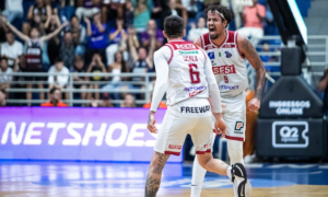 Lucas Dias e Scala comemoram o triunfo do Sesi Franca sobre o Minas Tênis Clube. Foto: Marcos Limonti/SFB Agora são apenas duas...