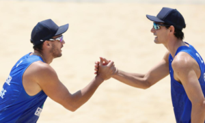 André e George estão nas quartas de final do torneio masculino de vôlei de praia dos Jogos Pan-Americanos. Jogando pela primeira vez...