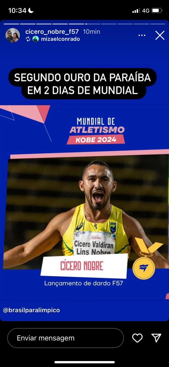 Já neste sábado foi a vez de Cícero Nobre colocar a medalha de ouro no peito, ao vencer a prova de lançamento de dardo, classe T57.