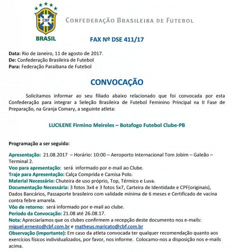 A paraibana Lú Meireles é convocada pela Seleção Brasileira de futebol feminino. Natural de Cruz de Espírito Santo, terra que revelou craques como Durval, com maior número de títulos estaduais entre os jogadores do Brasil, Lú Meireres é a primeira paraibana convocada para Seleção Brasileira, principal, no futebol feminino.
