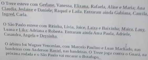 O Kashima que jogará nesta segunda diante das Belas do Botafogo, segundas colocadas dentro da competição, na Arena Gurugi, às 19h, cidade do Conde. O destaque do Treze foi a atacante Raquel, autora de quatro gols, Daniele dois, Raila, Jeslaine e Gabiana, um cada. Maira e Deizinha descontaram para o São Paulo.