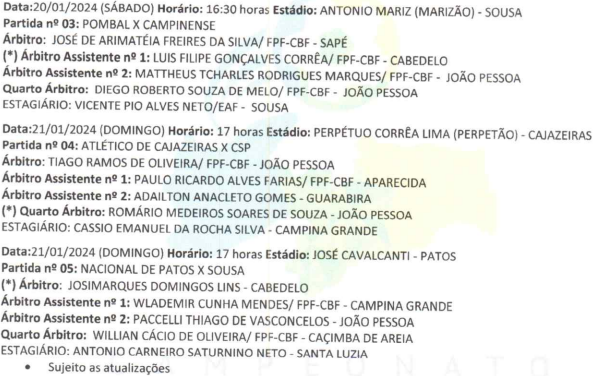 Com a tabela picotada, a primeira rodada do Campeonato Paraibano da Primeira Divisão de 2024 programa mais três partidas, para este fim de semana, com jogos, sábado (20) e domingo (21). A competição já teve dois jogos realizados, em dias diferentes.