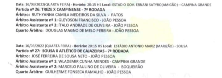Além da arbitragem para Treze x Campinense, também estão definidos os árbitro para a partida Sousa Atlético, nesta quarta-feira (16)., no estádio Marizão, em Sousa. José Ferreira Neto comando o duelo do Sertão. Veja a escala para os dois clássico: