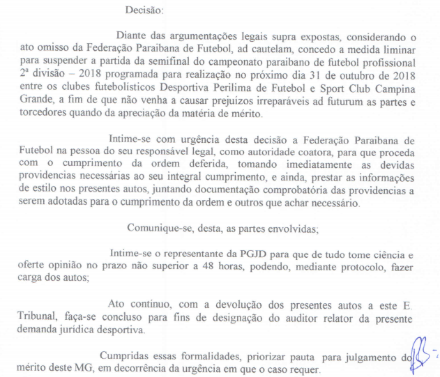 A diretoria da Perilima recorreu ao Superior Tribunal de Justiça Desportiva das CBF, com o objetivo de derrubar a decisão do presidente da Tribunal de Justiça Desportiva de Futebol da Paraíba, Ricardo Barros, que deferiu perdido do Sport Club Lagoa Seca e paralisou o Campeonato Paraibano da Segunda Divisão.