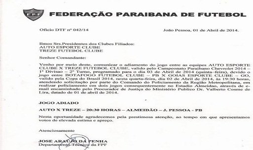 FutebolPolícia Militar manda adiar jogo entre Auto x Treze Compartilhar Tweetar Compartilhar Compartilhar Email ComentáriosMais uma partida adiada. Desta vez, o departamento técnico da Federação Paraibana de Futebol divulgou nota explicando os motivos do adiamento da partida entre Auto Esporte x Treze, que seria disputado nesta quinta-feira. Notícias Relacionadas: Compartilhar Tweetar Compartilhar Compartilhar Email 1 Comentário 1 Comentário Deixe um Comentário Cancelar respostaO seu endereço de e-mail não será publicado. Campos obrigatórios são marcados com *Comentário *Nome * E-mail * Site Salvar meus dados neste navegador para a próxima vez que eu comentar. ΔEsse site utiliza o Akismet para reduzir spam. Aprenda como seus dados de comentários são processados.