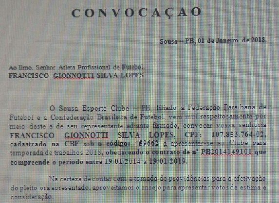 O presidente de Sousa, Aldeone Abrante divulgou uma nota fazendo uma convocação ao meia Gionnotti, para se apresentar imediatamente ao clube, para iniciar treinamentos. Segundo, Aldeone Abrantes o jogador estava na Portuguesa de Desportos e seu contrato terminou no 31 de dezembro passado. Gionnotti é Federado no Sousa e tem contrato até janeiro de 2019, de acordo com o dirigente. Veja a nota: