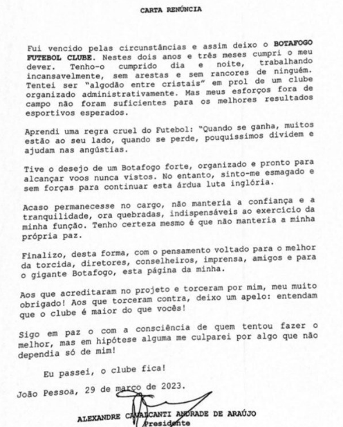 Nessa terça-feira (28/3), o clube anunciou Renan Mobarack como novo diretor executivo de futebol do Botafogo, mas recuou da contratação nesta quarta-feira (29/3). Cavalcanti teria sido pressionado por investidores do clube a recuar da contratação de Mobarack, o que desagradou o então presidente.