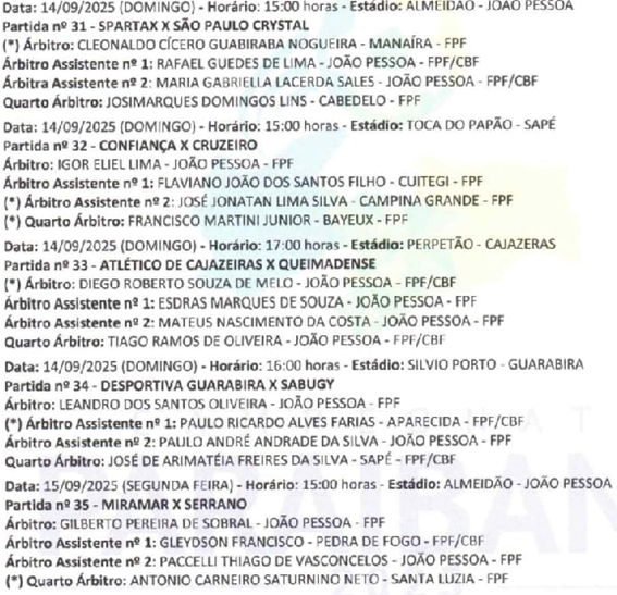 Os principais árbitros e assistentes, atualmente na Paraíba, não foram escalados para a rodada sete do Campeonato Estadual da Segunda Divisão, marcada para este fim de semana. Na escala, não aparecem os nomes de Ruthyanna Camila, Afro Rocha, Luis Felipe e Schumacher Marques Gomes.