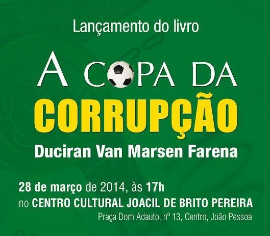O procurador da República Duciran Farena lançará o livro A Copa da Corrupção, no dia 28 de março, em João Pessoa. A obra, que reúne artigos e crônicas divulgadas por ele na imprensa e alguns textos inéditos, aborda a corrupção e a impunidade em episódios como a Copa do Mundo e o Mensalão.Duciran Farena ainda expõe na coletânea artigos críticos sobre temas que foram objeto de debate na sociedade brasileira nos últimos meses, como as nomeações para o Supremo Tribunal Federal e as idas e vindas de suas decisões, os protestos de rua, as pirâmides financeiras, a lei da anistia, o sistema carcerário, a cura gay, direitos humanos, criminalização dos movimentos sociais, minorias e problemas urbanos, dentre outros assuntos.