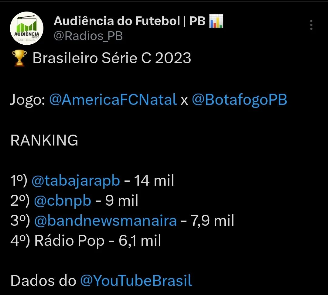 A rádio Tabajara ficou em primeiro lugar no jogo entre América-RN x Botafogo – PB na noite do último sábado (12).