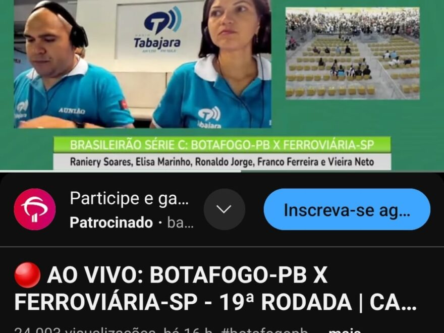 A Rádio Tabajara ficou, mais uma vez, na liderança absoluta em audiência no YouTube entre rádios de João Pessoa que transmitiram a partida entre Botafogo-PB x Ferroviária-SP, disputada neste sábado (24), no Estádio Almeidão, em João Pessoa, válida pela 19ª Rodada da Série C do Campeonato Brasileiro.