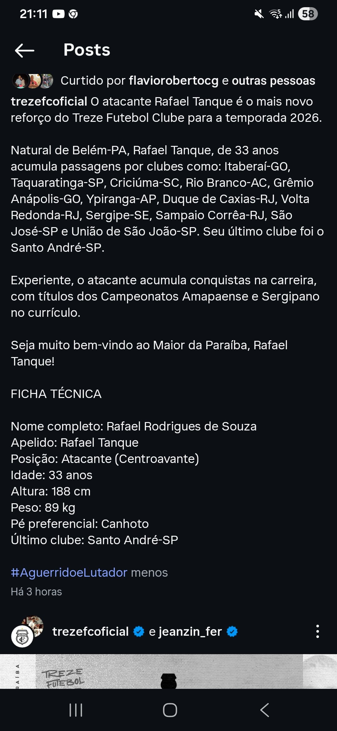 Uma terça-feira (10) de movimentação no estádio Presidente Vargas, com duas contratações de peso para reforçar o elenco do Treze. O meia Jean Carlo, anunciado no início da tarde e o atacante Rafael Tanque, confirmado no período da noite.