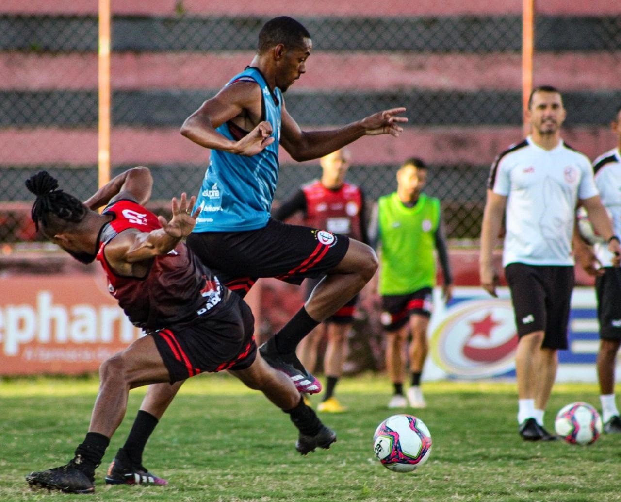 Após o aquecimento, o grupo foi dividido em dois para trabalhos táticos de especificidades no gramado do estádio Renatão. O técnico Ranielle Ribeiro orientou o grupo em diferentes ações visando o seu modelo de jogo.