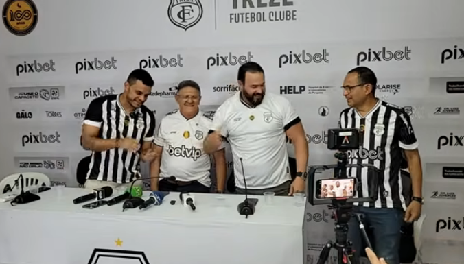 Vestindo uma camisa do Treze, composta, o novo treinador do alvinegro, Roberto Fernandes foi apresentado oficialmente, nesta quinta-feira (6). Com informação da Revista Treze Magazine, através do youtube. Foto – Onivaldo Elias Bob