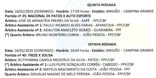 Para o jogo entre Nacional de Patos e Auto Esporte, também no domingo (16), às 17h, no estádio José Cavalcanti, em Patos, o árbitro é José de Ariomateia.
