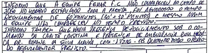 O jogo seria contra o Femar que não compareceu sendo considerado perdedor. A partida estava marcado para ser disputado no estádio José Cavalcanti, em Patos. Mais um fato que mostra a desorganização que ainda habita o nosso futebol.