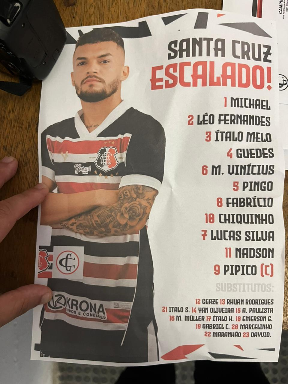 SANTA CRUZ: Michael; Léo Fernandes, Ítalo Melo (Yan de Oliveira), Guedes e Marcos Vinícius (Matheus Muller); Pingo (Ítalo Henrique), Fabrício e Chiquinho (Emerson Galego); Lucas Silva, Nadson (Marcelinho) e Pipico. Técnico: Felipe Conceição.