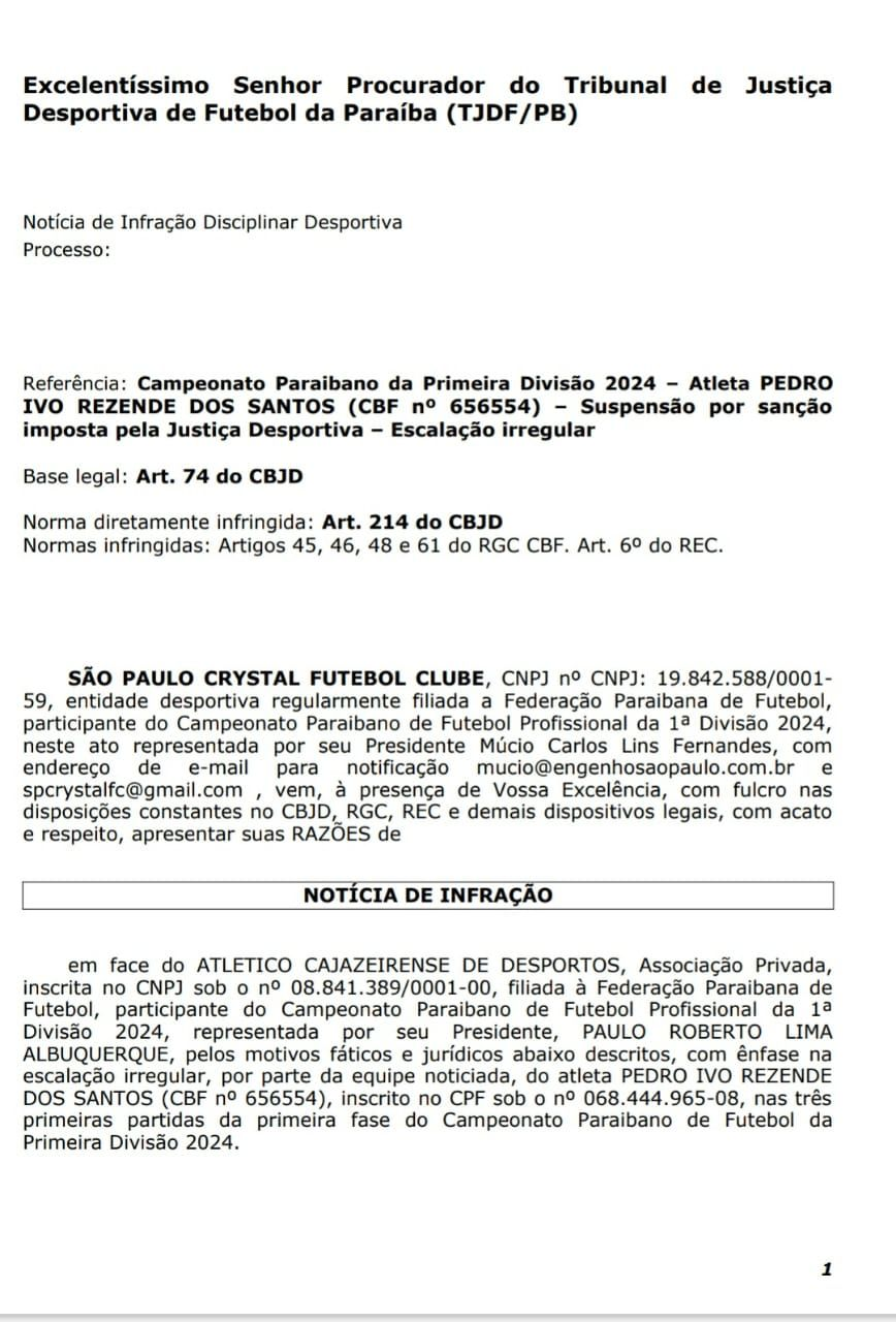 A diretoria do São Paulo-PB entrou com recurso contra Atlético de Cajazeiras junto ao Tribunal de Justiça Desportiva de Futebol da Paraíba. O tricolor alega que o time Sertanejo utilizou o zagueiro Pedro Bahia de maneira irregular.