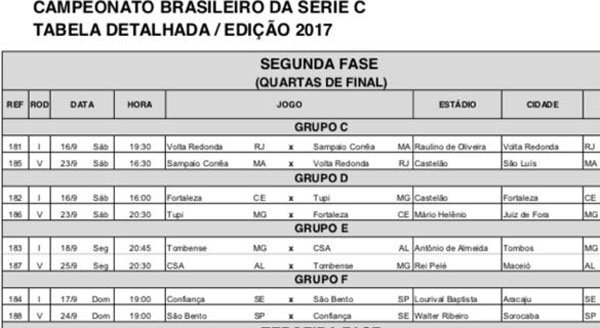 A segunda fase do Campeonato Brasileiro da Série C começa sábado. A CBF divulgou neste segunda feira os confrontos.