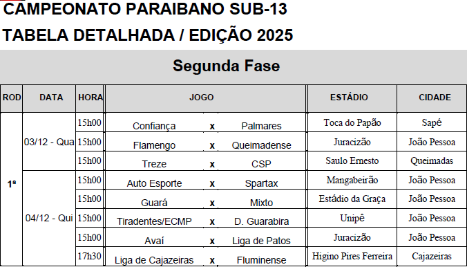 A segunda fase do Campeonato Paraibano de Futebol Masculino Sub-13 começa nesta quarta-feira (3), com três partidas. Outros cinco jogos estão programados para a quinta-feira (4). As informações da Federação Paraibana de Futebol através da divulgação da tabela, nesta segunda-feira (1).