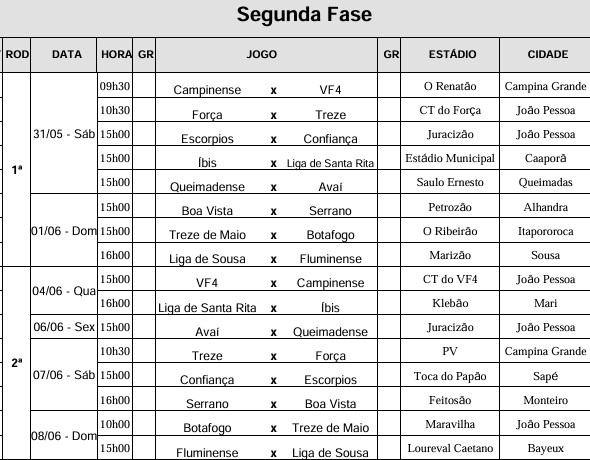 A segunda fase do Campeonato Paraibano de Futebol Masculino Sub-17 começa no próximo sábado (31), com cinco partidas. Outros três jogos estão programados para o domingo (1). A tabela oficial foi divulgada nesta terça-feira (27), pelo departamento de competições da Federação Paraibana de Futebol.