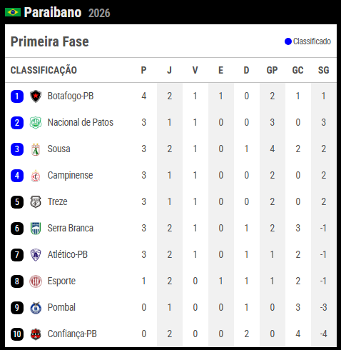 Nesta quarta-feira, aconteceram, pelo Campeonato Paraibano da Primeira Divisão de 2026: Serra Branca 2×1 Sousa; Atlético de Cajazeiras 1×0 Esporte de Patos, Confiança de Sapé 0x1 Botafogo-PB. Outros dois jogos serão disputados nesta quinta-feira: Pombal x Treze, Campinense x Nacional de Patos
