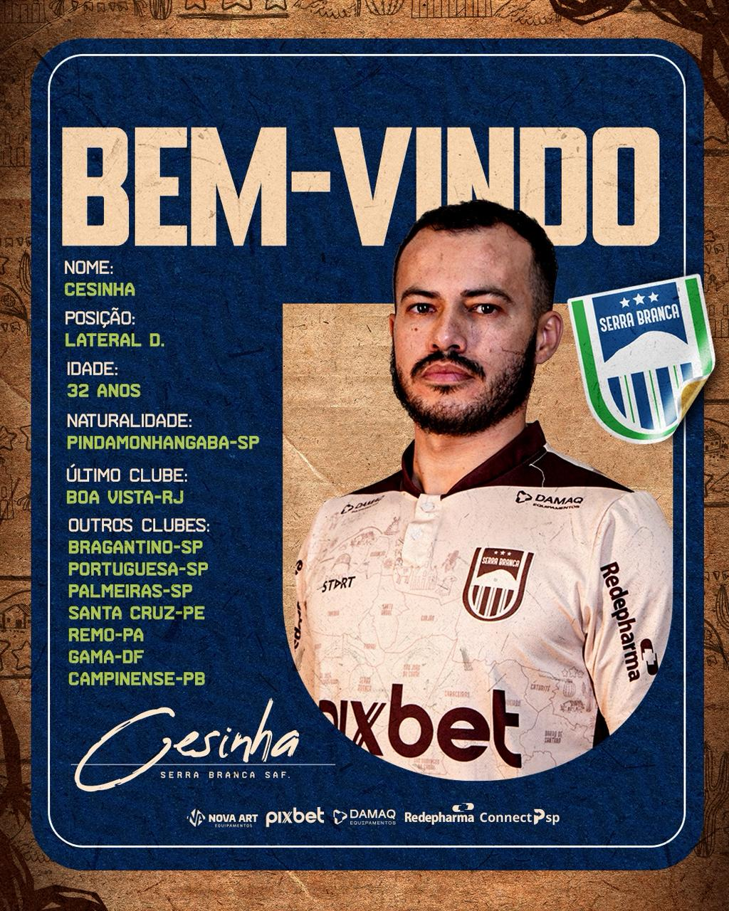 Trata-se do lateral direito Cesinha, de 32 anos, natural de Pindamonhangaba, em São Paulo. O atleta foi formado nas categorias de base do Palmeiras(SP), clube onde também iniciou sua trajetória como profissional. Ao longo da carreira, construiu um caminho com passagens por equipes como Bragantino(SP), Portuguesa(SP), Santa Cruz(PE), Remo(PA), Gama(DF), entre outros, sendo o Boa Vista(RJ) seu último clube.