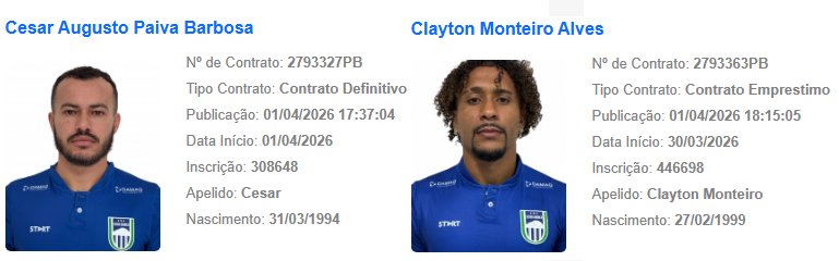 O atleta já está no CT Erasmo Alves Ribeiro, passou por avaliações físicas e médicas e já se encontra integrado ao elenco. Além de Cessinha o jogador Clayton também está regularizado com o nome no BID da CBF.