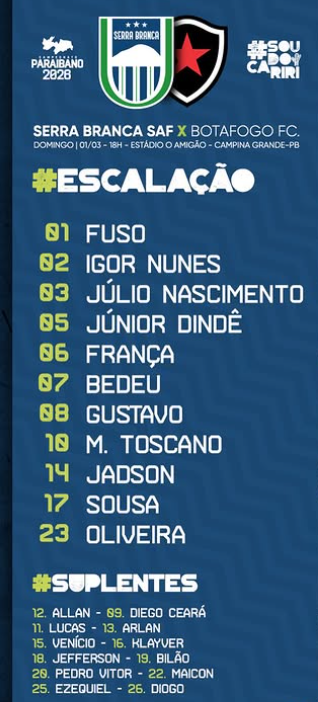 Serra Branca x Botafogo-PB, às 18h, no estádio Amigão, em Campina Grande, pela fase semifinal do Campeonato Paraibano da Primeira Divisão de 2026. O Serra Branca terminou na primeira fase na quarta colocação, com 14 pontos. O Botafogo-PB ficou na primeira posição, na primeira fase, com 16 pontos.
