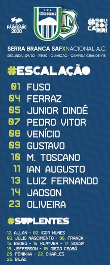 Serra Branca x Nacional de Patos. jogo com validade pela oitava rodada do Campeonato Paraibano da Primeira Divisão de 2026, nesta segunda-feira (9), às 19h30, no estádio Amigão, em Campina Grande.