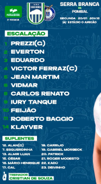 Para comandar a partida entre Serra Branca e Pombla, nesta segunda-feira (20), às 20h15, no estádio Amigão, em Campina Grande, foi escalado Bruno Monteiro. Os assistentes foram Cássio Emanuel e Maria Gabriella. O reserva, Luciano Gomes.