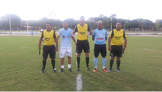 Arbitragem com os jogadores Leandro do CSP e Marcelino Paraíba da Perilima. Foto – Wellington Faustino