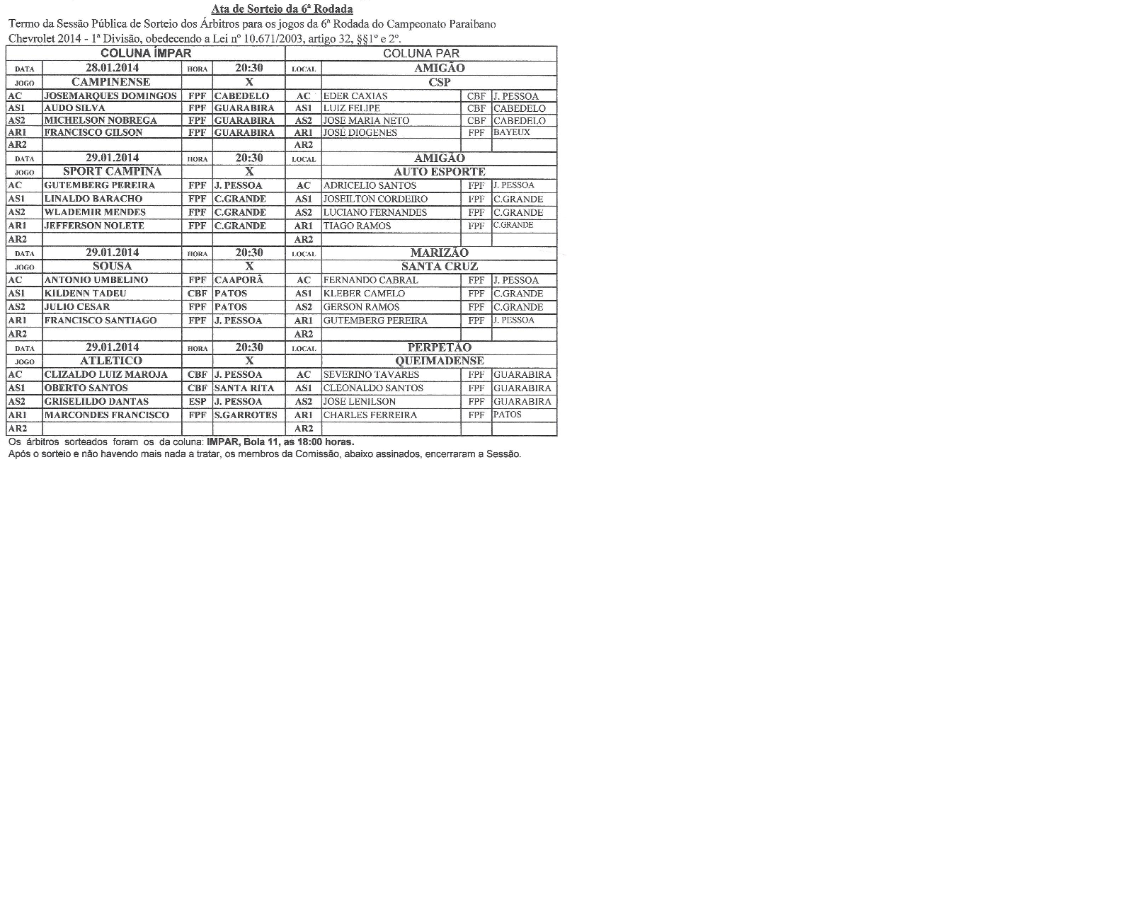 A sexta rodada da primeira fase do Campeonato Paraibano de 2014 começa nesta terça-feira, com o jogo entre Campinense 1×0 CSP, no estádio Amigão, às 20h30, em Campina Grande. Mais três partidas serão disputadas na quarta-feira: Atlético x Queimadense, Sport Campina x Auto Esporte e Sousa x Santa Cruz. Veja a escala de árbitros completa: