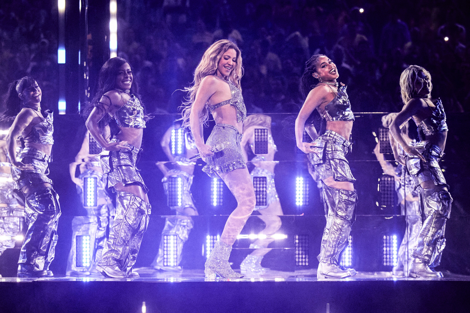 A colombiana abriu a celebração com o clássico “Hips Don’t Lie”, seguida por “Te Felicito”, “TQG” e “Puntería” com uma equipe de 12 dançarinos.