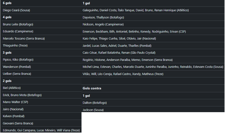 O site da Federação Paraibana de Futebol erra quando oficializa que o zagueiro Eduardo, do Campinense, marcou quatro gols. Os números gerais da artilharia são confusos em relação outros goleadores da competição. Veja a relação oficial da FPF: