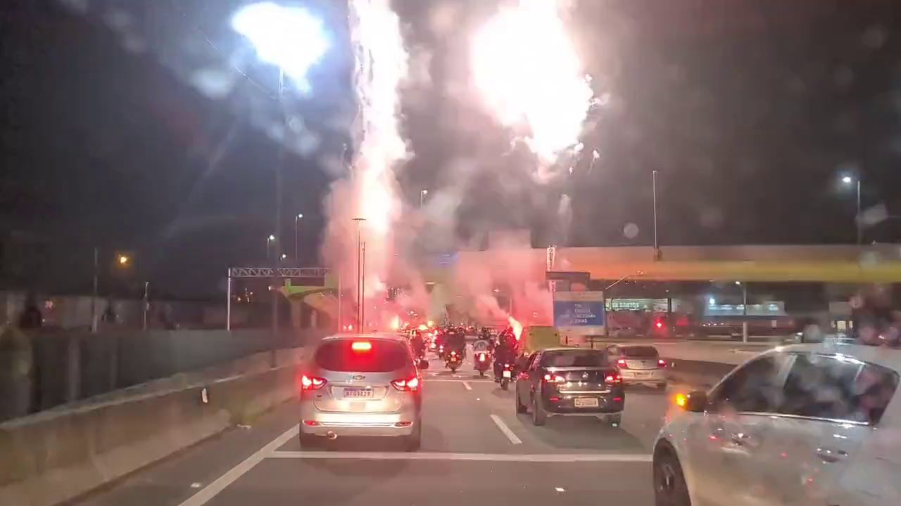 Corpo de Pelé é recebido com foguetório em Santos. Torcedores da Sangue Jovem e Torcida Jovem fizeram recepção para carreata, com bandeiras e estourando fogos até a Vila Belmiro, onde o caixão entrou pelo portão 4 – que é de direção aos vestiários dos árbitros. Quem estava de carro fez buzinaço.