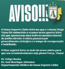 Veja a nota divulgada pela diretoria do Sousa informado que o jogador Diego Viana vai continuar no departamento médico.