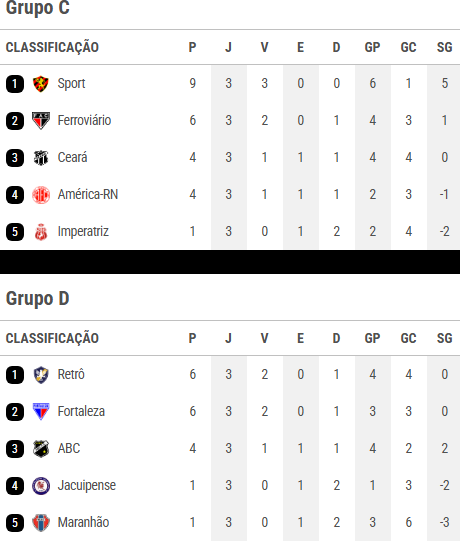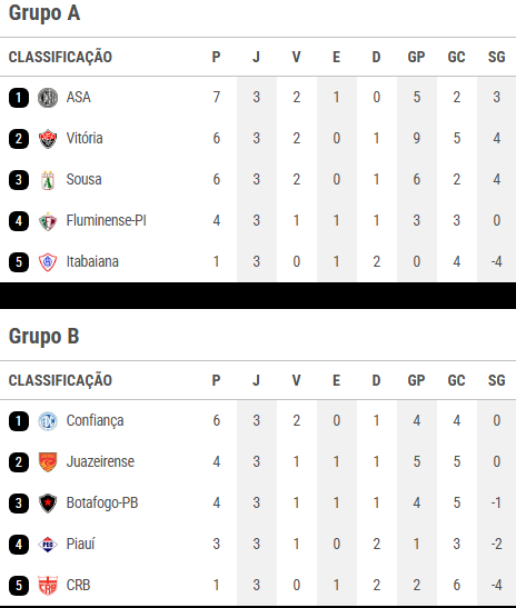 O Botafogo-PB, com apenas quatro pontos, após três partidas, precisa vencer os próximos dois jogos e ainda torcer por uma combinação de resultados entre seus concorrentes. Veja a classificação geral dos grupos A e B da Copa do Nordeste.