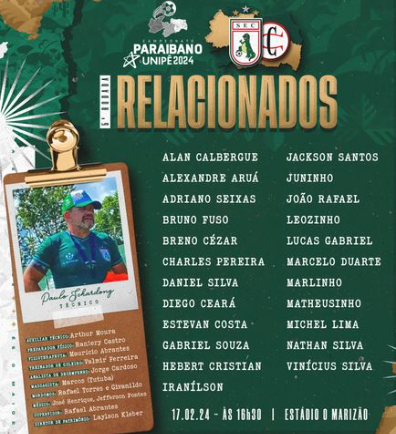 O Sousa divulgou a relação de jogadores para a partida deste sábado (17) contra o Campinense, pela quinta rodada do Campeonato Paraibano da Primeira Divisão de 2024, às 16h30, no estádio Antônio Mariz, na cidade de Sousa, no Sertão da Paraíba.