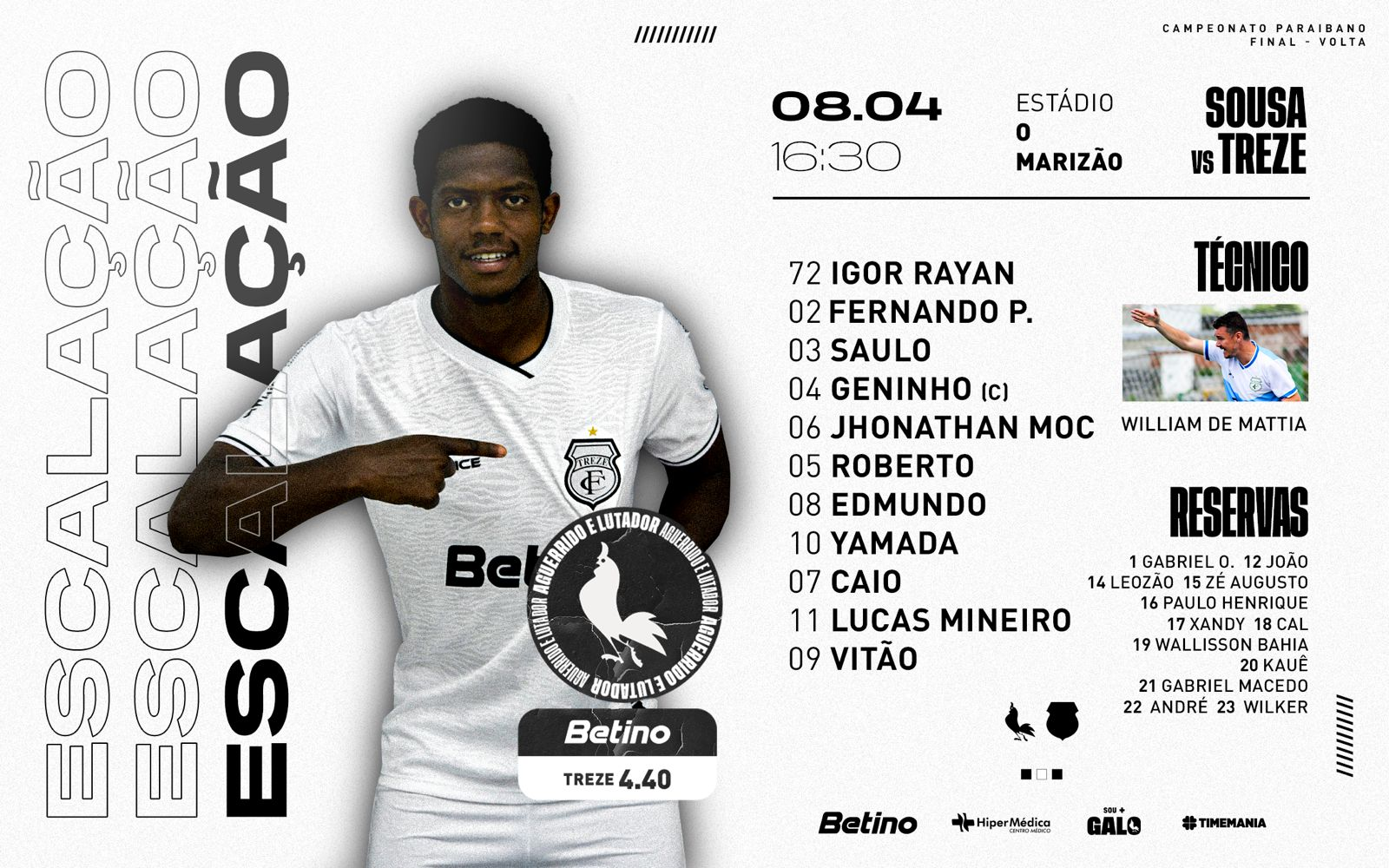 Os jogadores campeões pelo Treze: Igor Rayan, Fernando, Saulo, Geninho, Jhonathan Moc, Roberto, Edmundo, Yamada, Caio, Lucas Mineiro e Vitão. Gabriel Oliveira, João Marcos, Leozão, Zé Augusto, Paulo Henrique, Xande, Cal, Wallisson Bahia, Kauê Pires, Gabriel Macedo, André e Wilker.