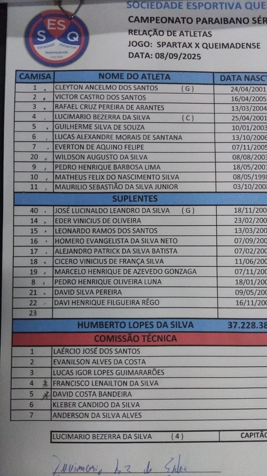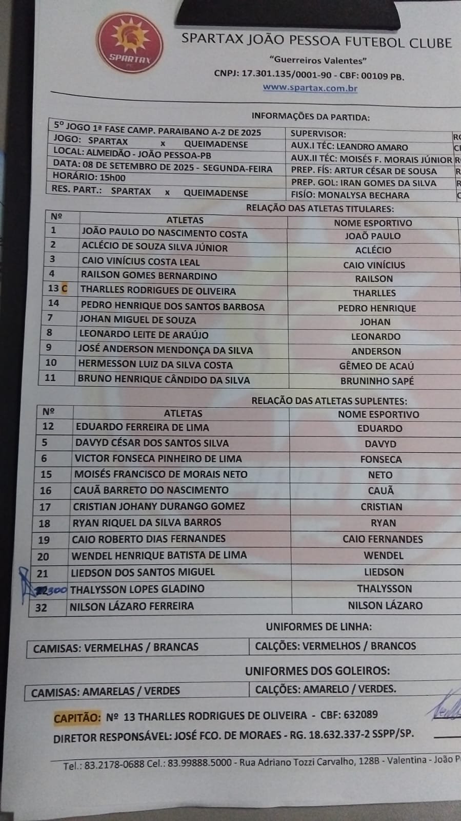Spartax 4 x 2 Queimadense, no estádio Almeidão, pelo Campeonato Paraibano da Segunda Divisão de 2025.