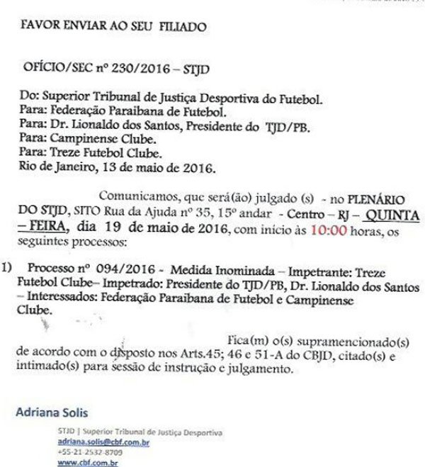 O edital divulgado pelo Superior Tribunal de Justiça Desportiva anuncia o presidente do Tribunal de Justiça Desportiva da Federação Paraibana de Futebol, Lionaldo Santos Silva, na pauta de julgamento como também a Federação Paraibana de Futebol.