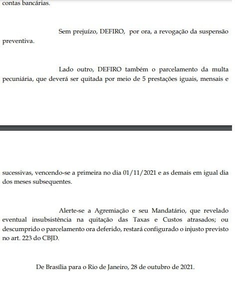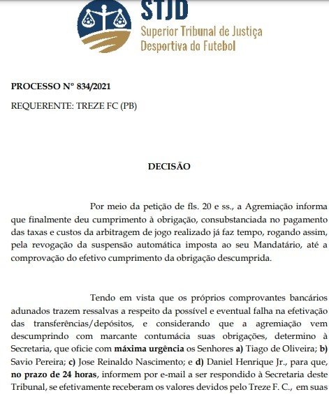 Em documento assinado pelo presidente do Superior Tribunal de Justiça Desportiva da CBF, o presidente do Treze Walter Junior, está liberado para reassumir os destinos do clube. O documento é assinado por Otávio Noronha, presidente do Superior Tribunal de Justiça Desportiva do Futebol.