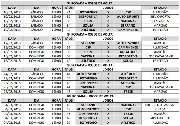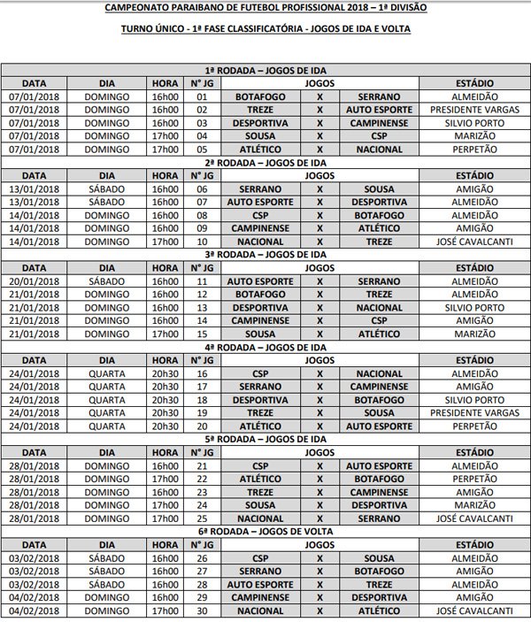 A tabela do Campeonato Paraibano da Primeira Divisão de 2018 foi divulgada pelo departamento técnico da Federação Paraibana de Futebol com estádios, seguindo determinação do Ministério Público, para cumprir o que manda o Estatuto do Torcedor.