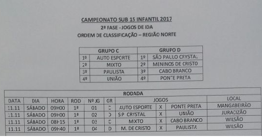 A Federação Paraibana de Futebol, através da diretoria técnica, divulgou a tabela da segunda fase do Campeonato Paraibano Sub 15, masculino. Estão classificados Auto Esporte, Mixto, Paulista, União, São Paulo, Meninos de Cristo, Cabo Branco e Ponte Preta. Confira a tabela completa.