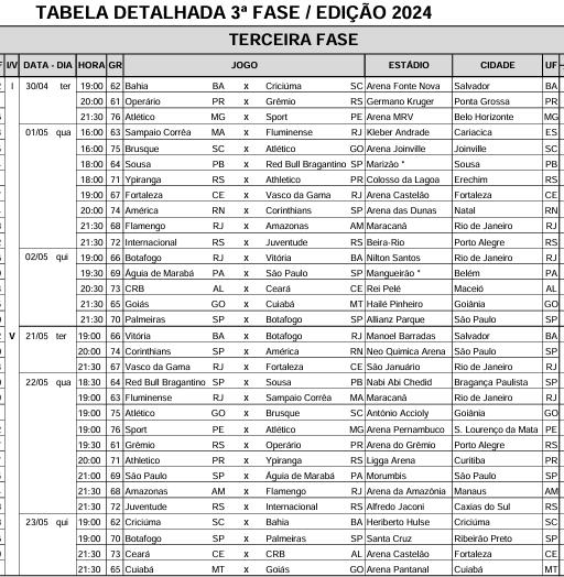 A CBF divulgou, nesta segunda-feira (22), o detalhamento da tabela dos jogos da terceira fase da Copa do Brasil 2024. A bola rola entre os dias 30 deste mês e 23 de maio. A primeira partida será na terça (30) entre Bahia e Criciúma, na Arena Fonte Nova, em Salvador.