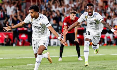 Com dois gols do brasileiro Rodrygo, o @realmadrid torna-se campeão da Copa do Rei da Espanha, após vencer o Osasuna, na cidade...